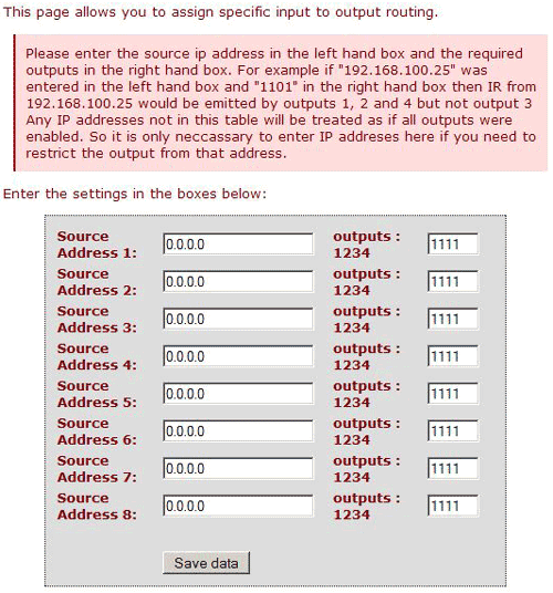 This allows you to assign a specific output to a command received from a specific IP address. This would allow several Keene IR Anywhere modules to be distributed around a local network and each module used as a routable IR source. (Note that the IR Anywhere module should be configured to a static IP address for reliable operation).